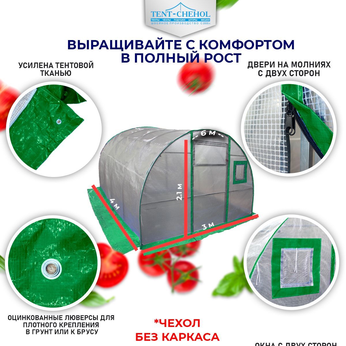 - Чехол усилен в загибах арки и дополнен по периметру внизу, а также накладками на двери и окна зелёным ПВХ с плотностью 300 гр/кв.м.